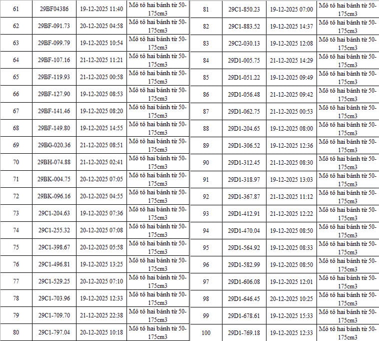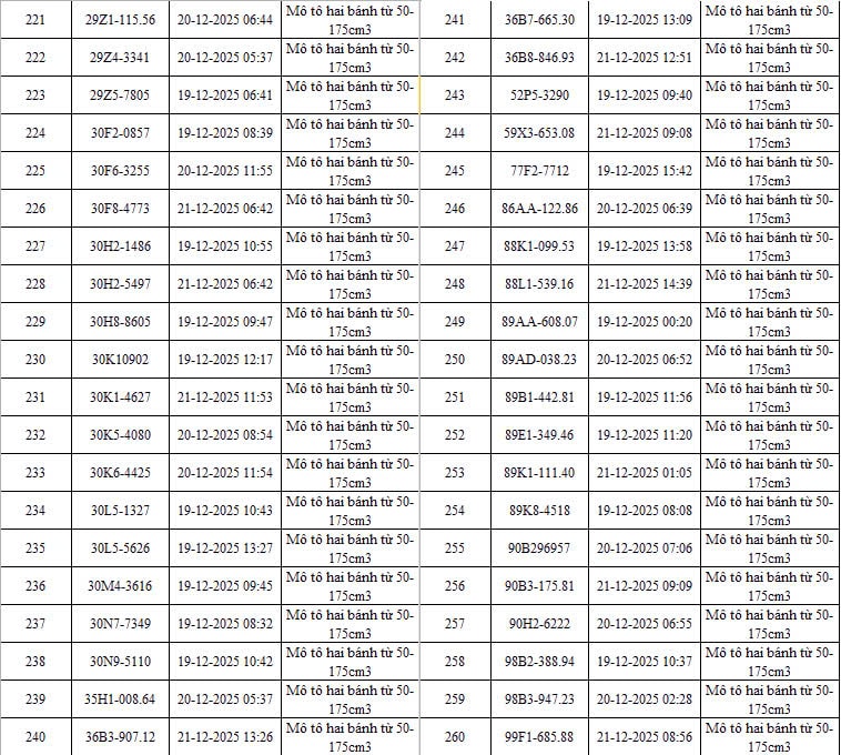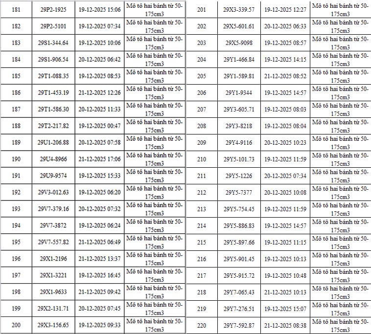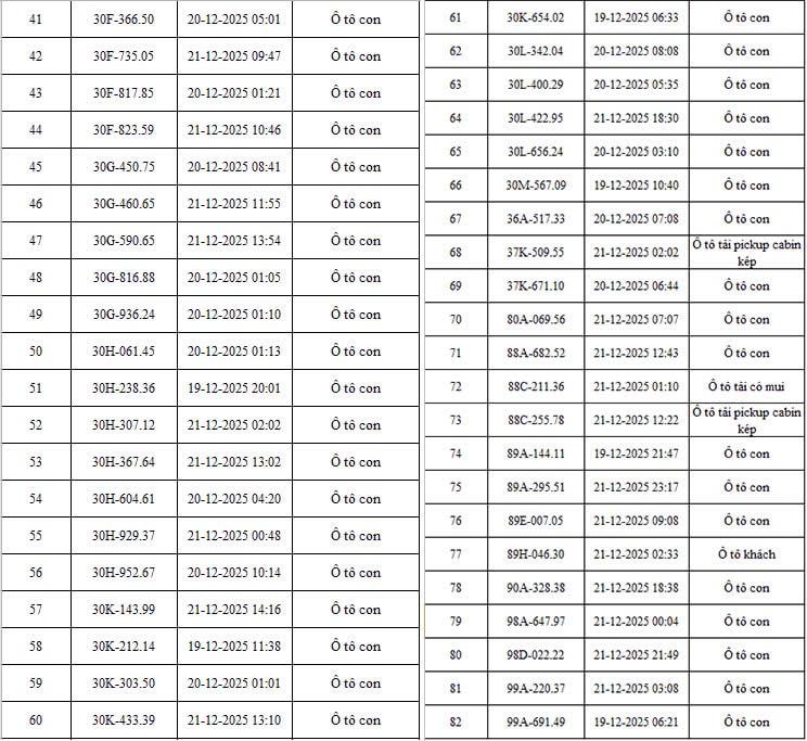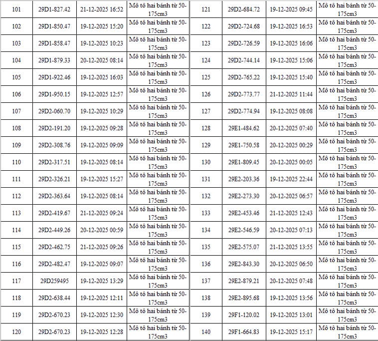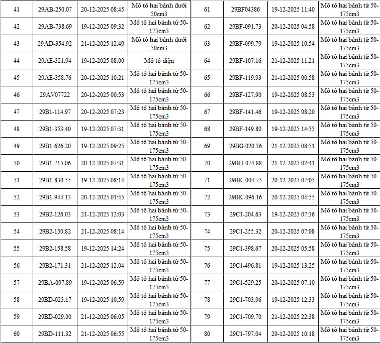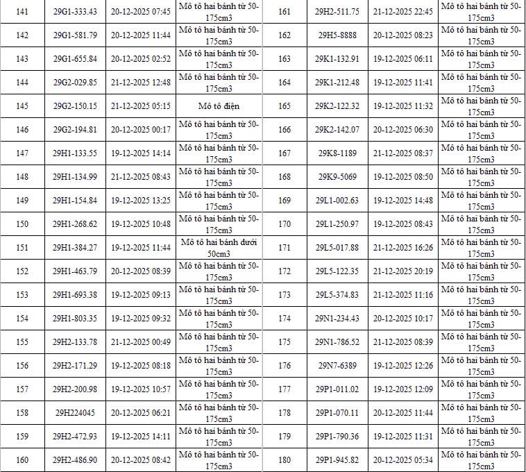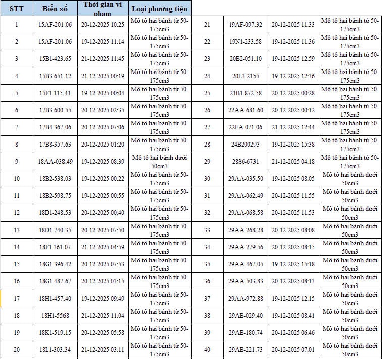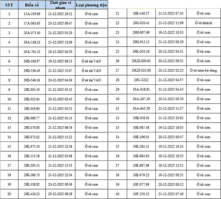 Ngày 6/1, Phòng Cảnh sát giao thông, Công an TP Hà Nội công bố danh sách 342 trường hợp phương tiện bị camera AI phát hiện vi phạm từ ngày 19-21/12/2025.