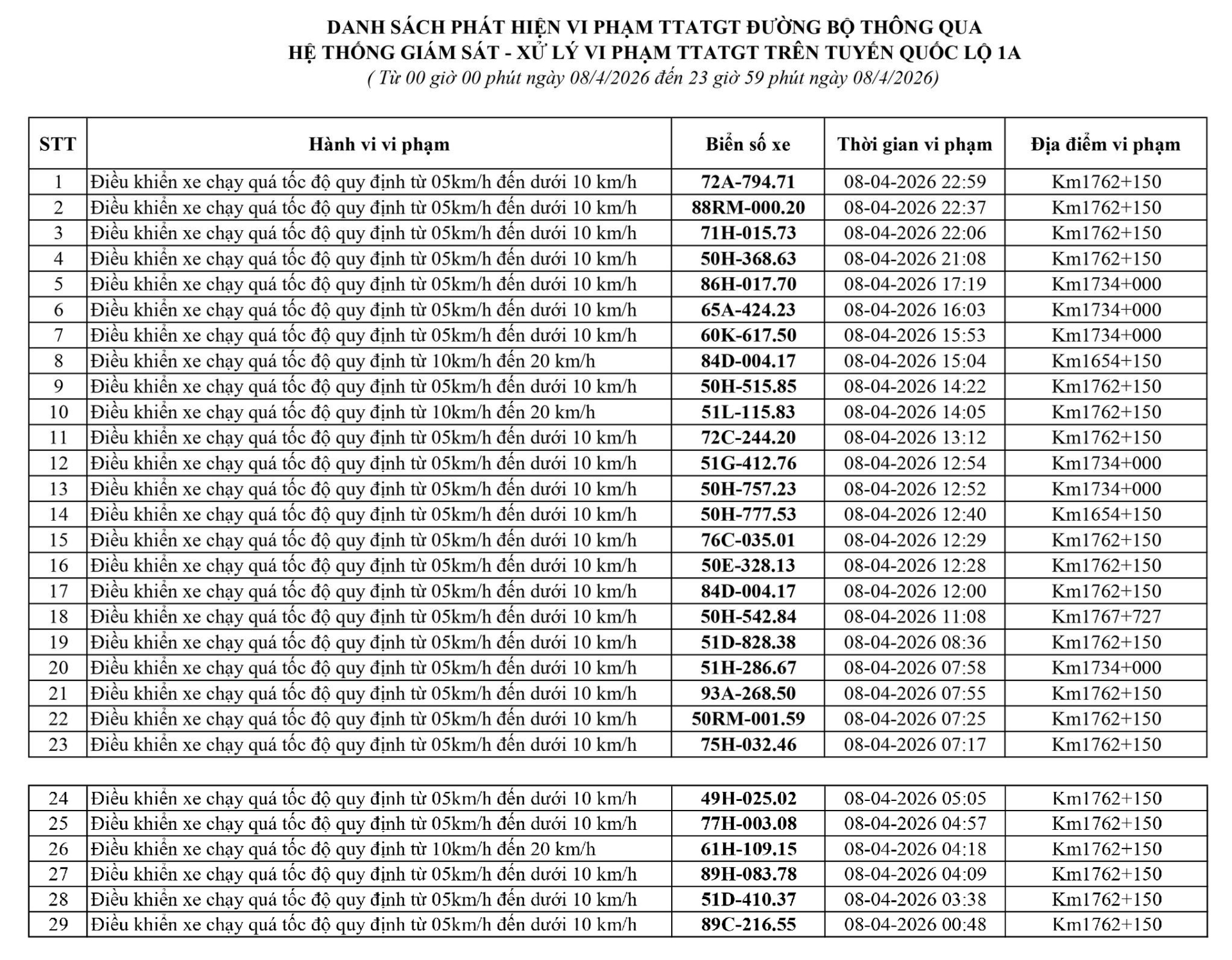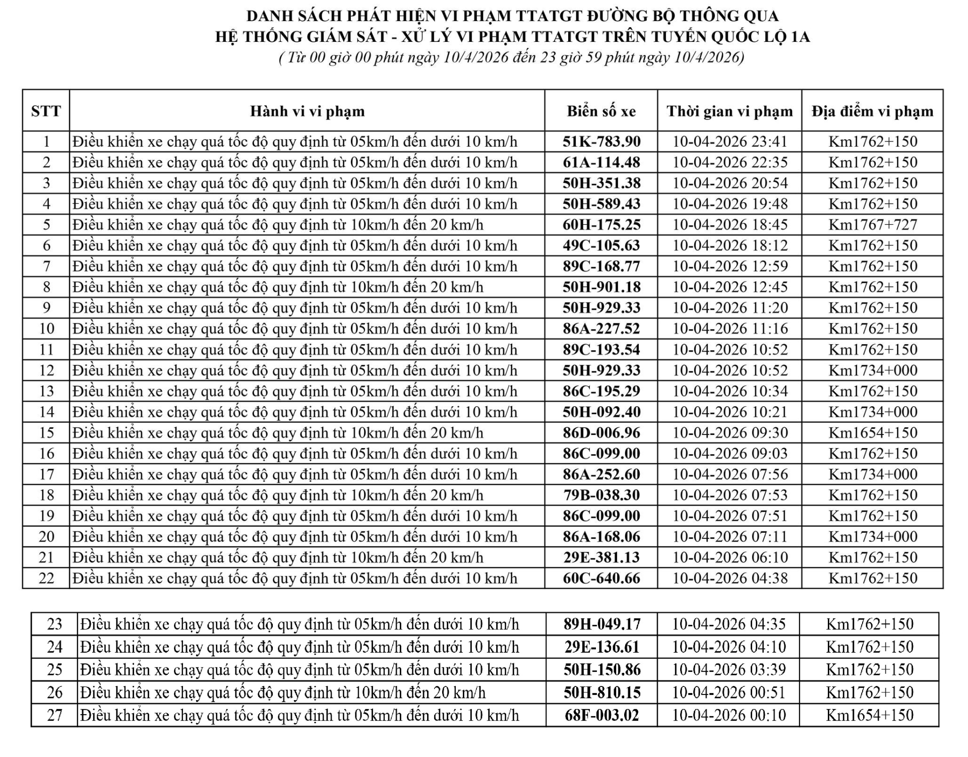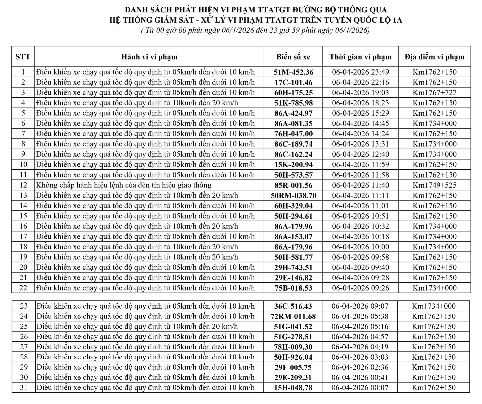 Công an tỉnh Lâm Đồng đã công bố danh sách các phương tiện vi phạm lỗi chạy quá tốc độ trong tuần từ ngày 6/4 - 11/4/2026.