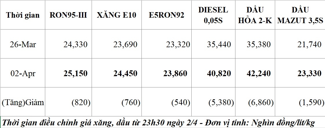 Giá dầu diesel 0.05S từ 23h30 ngày 2/4 cũng tăng 5.380 đồng/lít, giá bán mới là 40.820 đồng/lít; Dầu hỏa tăng 6.860 đồng/lít giá bán là 42.240 đồng/lít; Giá dầu mazut 180CST 3.5S kỳ này tăng 1.590 đồng/lít, giá bán mới là 23.330 đồng/kg.